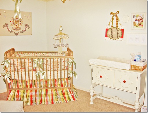 i placed the sweetest gift of all on the top of harper’s shelves. it’s a vintage-like train that jenny’s husband gave her last christmas…soon after we had selected the vintage circus fabric. i also added pages from vintage nursery rhyme books to photo frames throughout the shelves and the room.